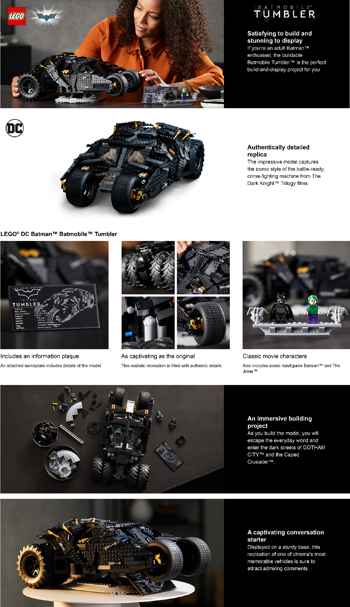 - •Includes a buildable Tumbler Batmobile™ with stand, plus Batman™ and The Joker™ minifigures.