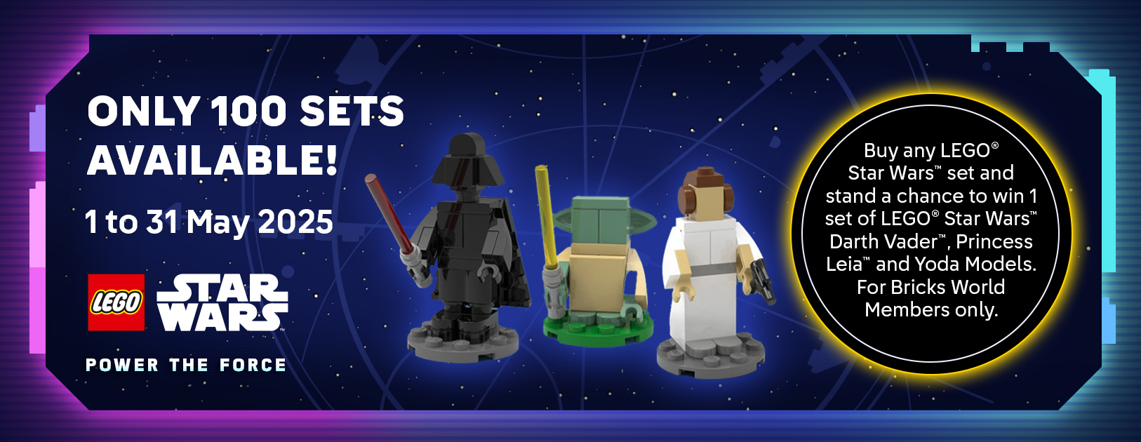 Buy any LEGO® Star Wars™ set and stand a chance to win 1 set of LEGO® Star Wars™ Darth Vader™, Princess Leia™ and Yoda Models. For Bricks World Members only.